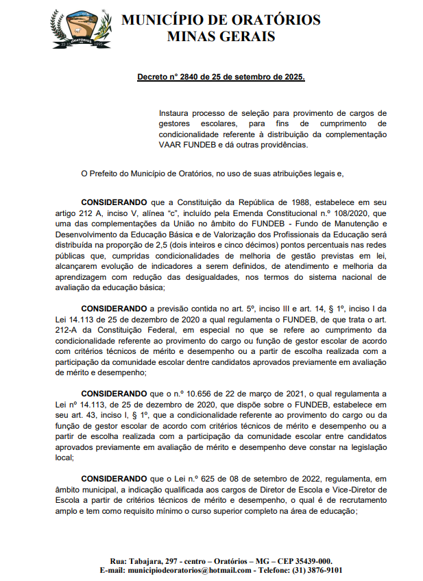 DECRETO 2840- Processo Selecao Gestores Escolares VAAR 2025 – EDITAL ORATÓRIOS