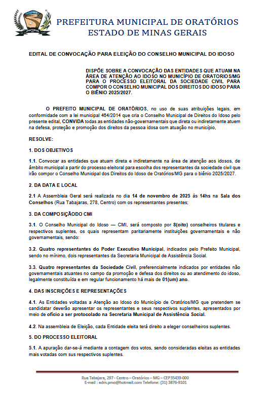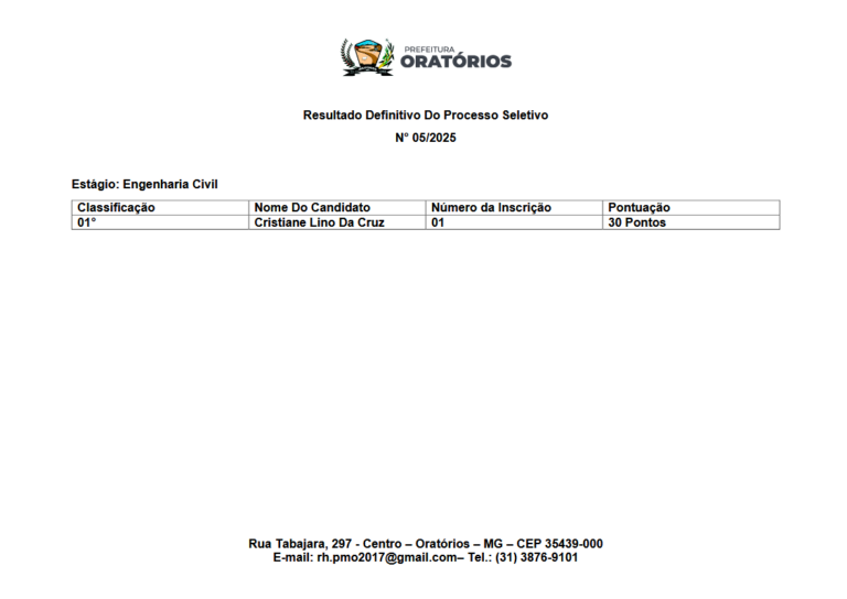 O MUNICÍPIO DE ORATÓRIOS/MG, torna público que realizará processo seletivo de pessoal, através da Secretaria de Esportes, com inscrições abertas do dia, 13/01/2026 a 22/01/2026,
