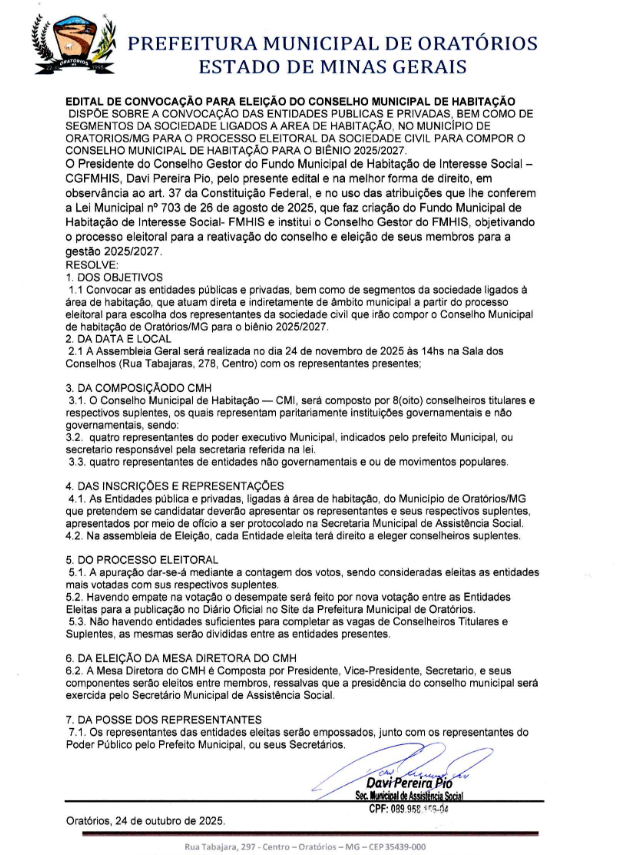 DISPÕE SOBRE A CONVOCAÇÃO DAS ENTIDADES PUBLICAS E PRIVADAS, BEM COMO DE SEGMENTOS DA SOCIEDADE LIGADOS A AREA DE HABITAÇÃO, NO MUNICÍPIO DE ORATORIOS/MG PARA