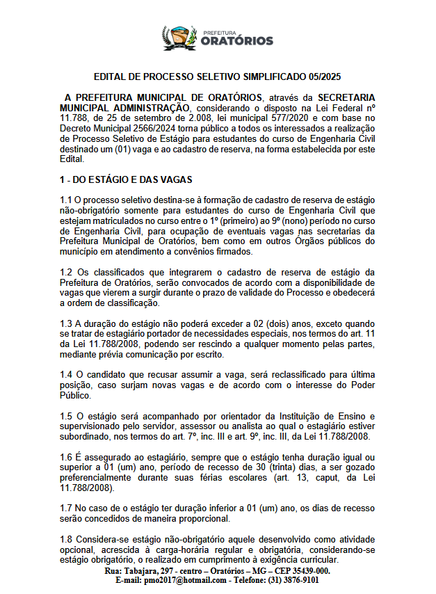 A PREFEITURA MUNICIPAL DE ORATÓRIOS, através da SECRETARIA MUNICIPAL ADMINISTRAÇÃO, considerando o disposto na Lei Federal nº 11.788, de 25 de setembro de 2.008, lei