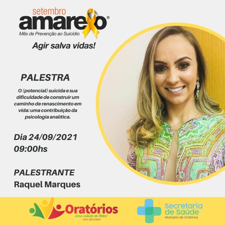 A Secretaria Municipal de Saúde, convida a todos para participarem da Palestra de encerramento do Mês Setembro Amarelo que acontecerá no dia 24/09/2021. Palestrante Raquel