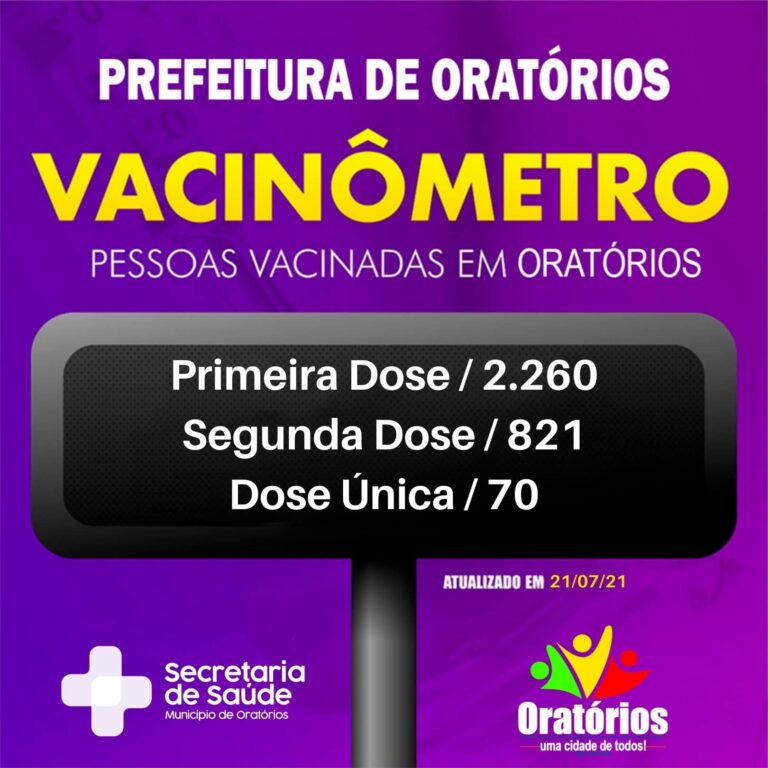 A última atualização, do dia 21/7/21, feita pela Secretaria de Saúde, mostra que 2.260 Oratorienses já receberam a primeira dose da vacina contra a covid-19.