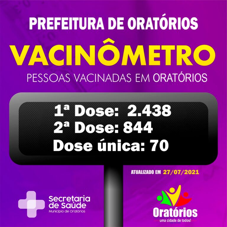 VACINÔMETRO DA VACINAÇÃO CONTRA O COVID 19 EM ORATÓRIOS. Confira o balanço da vacinação contra a Covid-19 no município de Oratórios atualizado em 27
