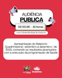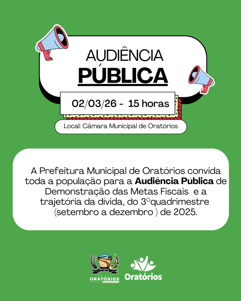 A Prefeitura Municipal de Oratórios convida toda a população para a Audiência Publica de demonstração das Metas Fiscais e a trajetória da dívida, do 3°quadrimestre (setembro a dezembro ) de 2025.