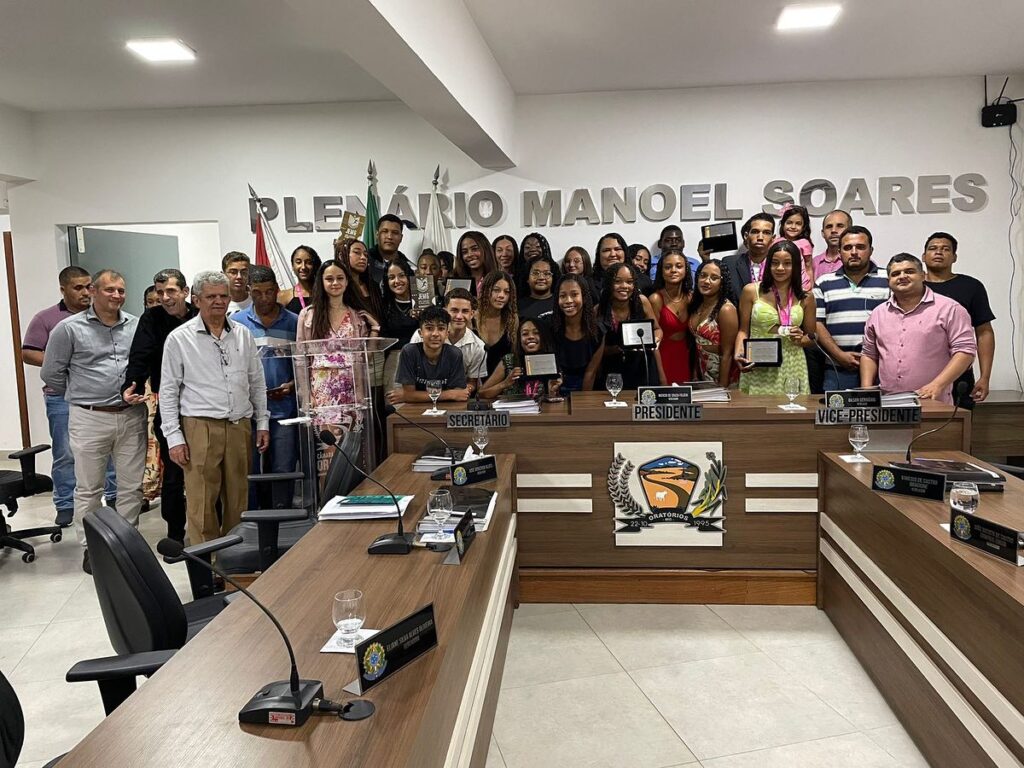 Os alunos do projeto CRIA Oratórios receberam uma placa especial do legislativo, em homenagem ao desempenho e conquistas nos Jogos Escolares de Minas Gerais JEMG 2023.