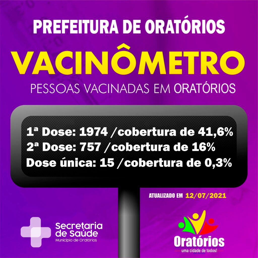 A última atualização, do dia 12/7/21, feita pela Secretaria de Saúde, mostra que 1.974 Oratorienses já receberam a primeira dose da vacina contra a covid-19, cerca de 41% da população do município. Confira, no infográfico, a distribuição, até aqui!